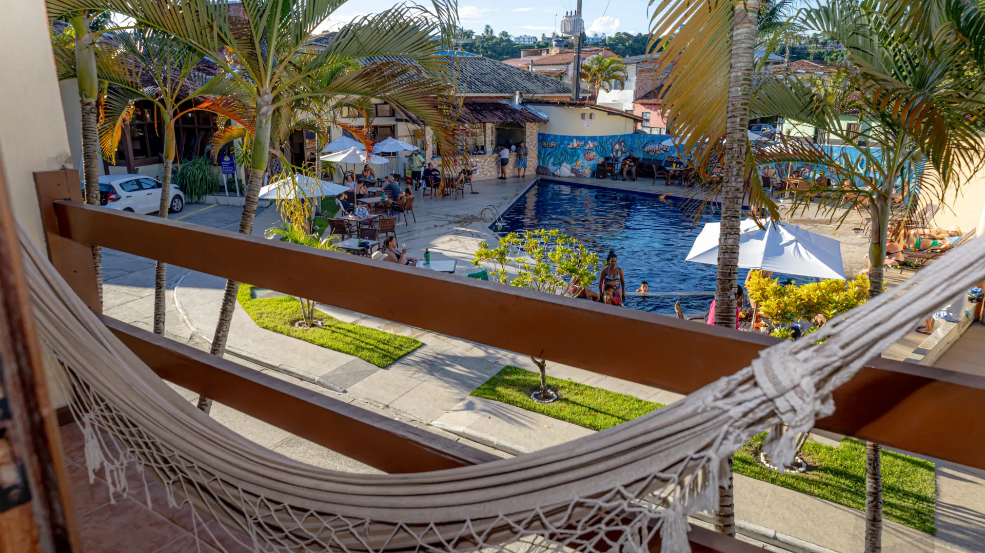 Já o bar, localizado próximo à área da piscina, é ideal para quem busca refeições rápidas ou lanches ao longo do dia. O cardápio inclui porções, petiscos, drinks, sorvetes, picolés, açaí e outras opções leves e refrescantes, perfeitas para curtir os momentos de lazer no hotel.